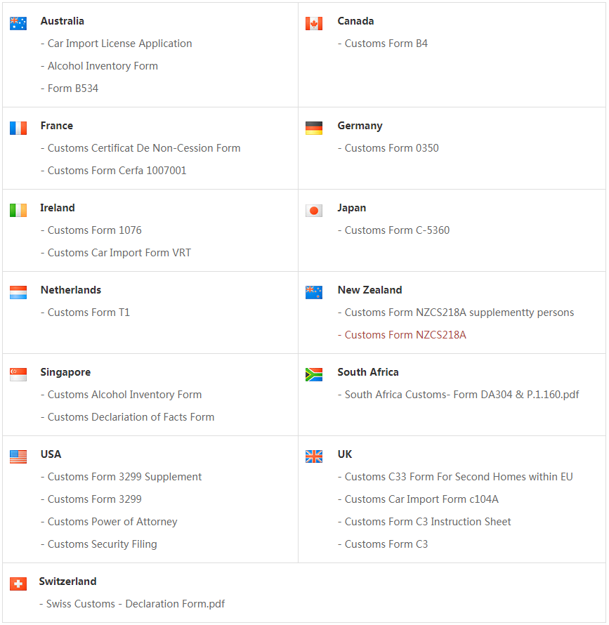 各国海关所需表格及文件